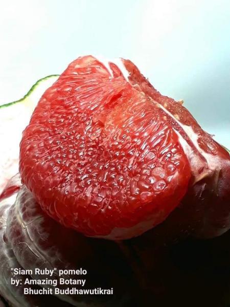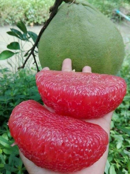 Bưởi da xanh giống Thái Lan cho năng suất cao, múi bưởi màu hồng đậm, không hạt, độ ngọt cao.